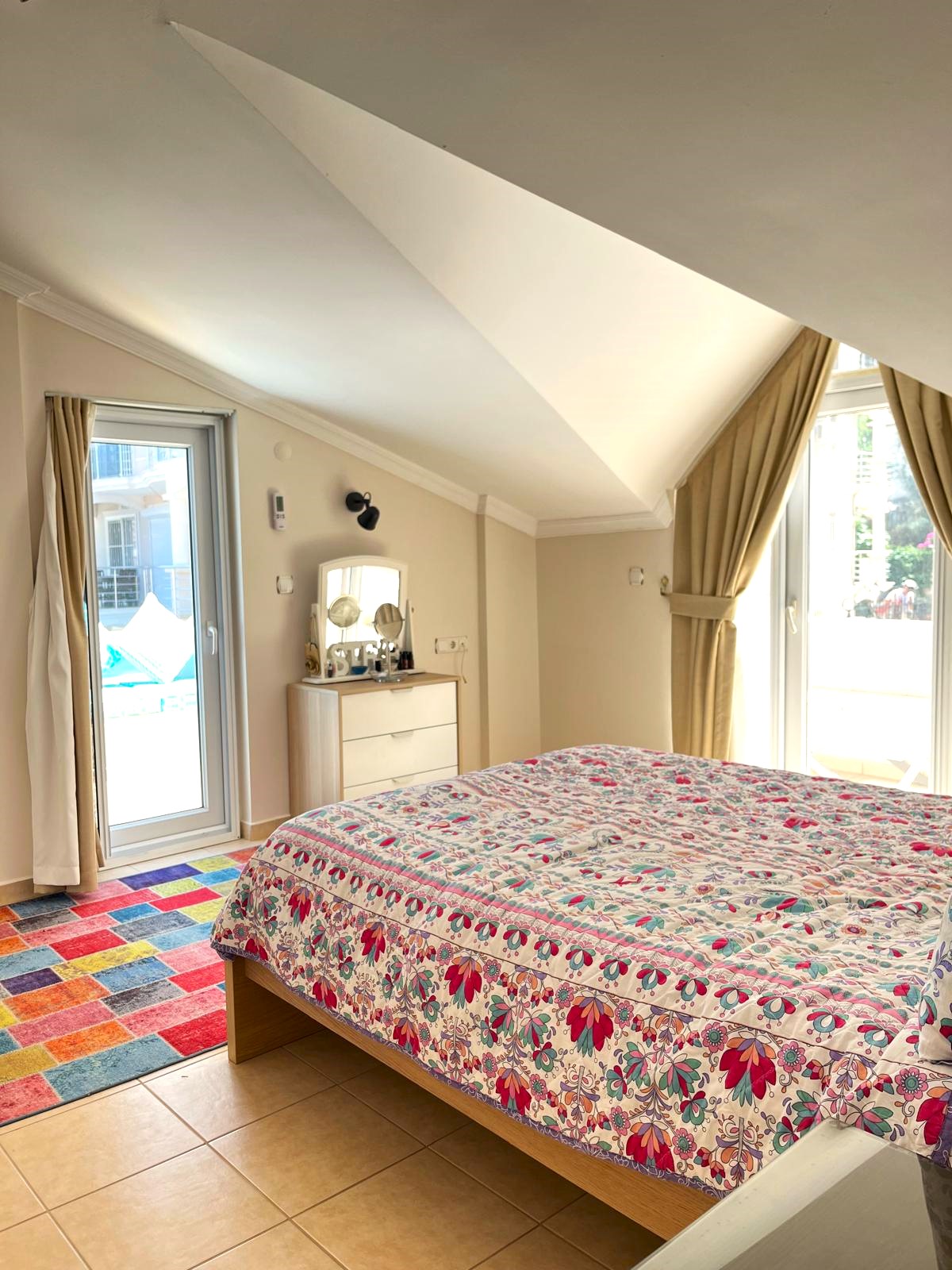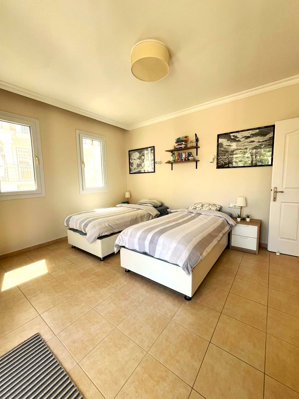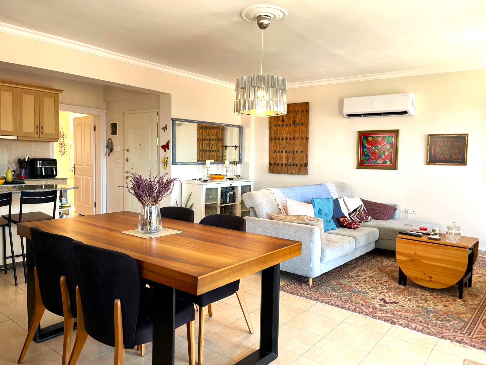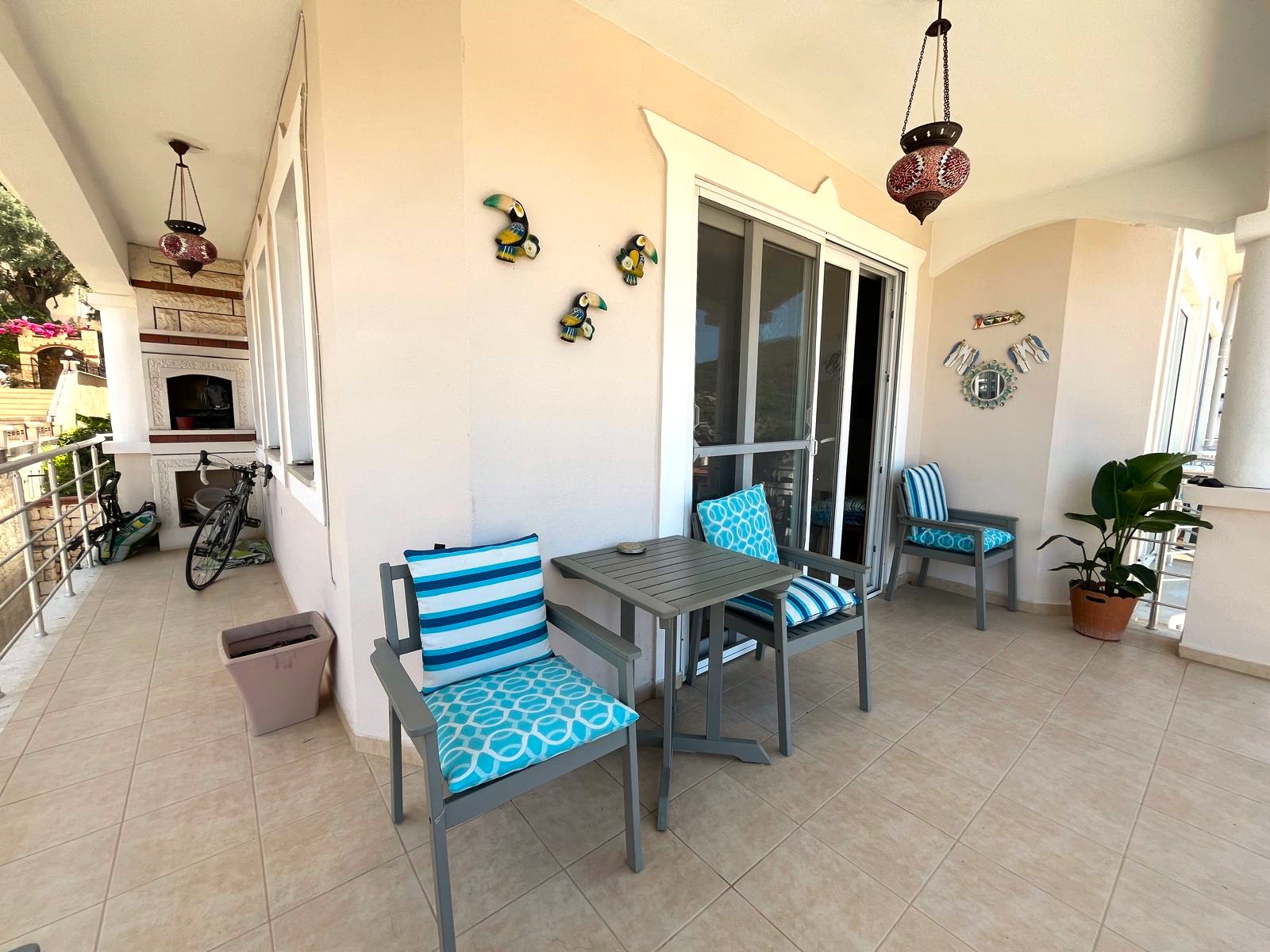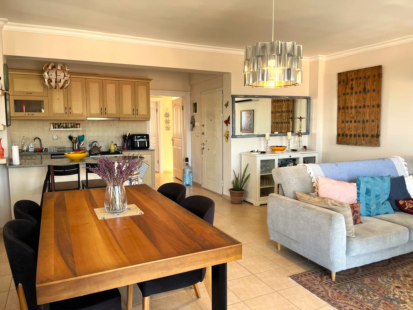 This spacious 3-bedroom apartment is part of a well-maintained complex, offering both privacy and community living. The interior is thoughtfully laid out with a bright open-plan living area, modern kitchen, and two sleek bathrooms. Large windows and a generous balcony showcase stunning views of the mountains, sea, and lush greenery that define the Fethiye region.