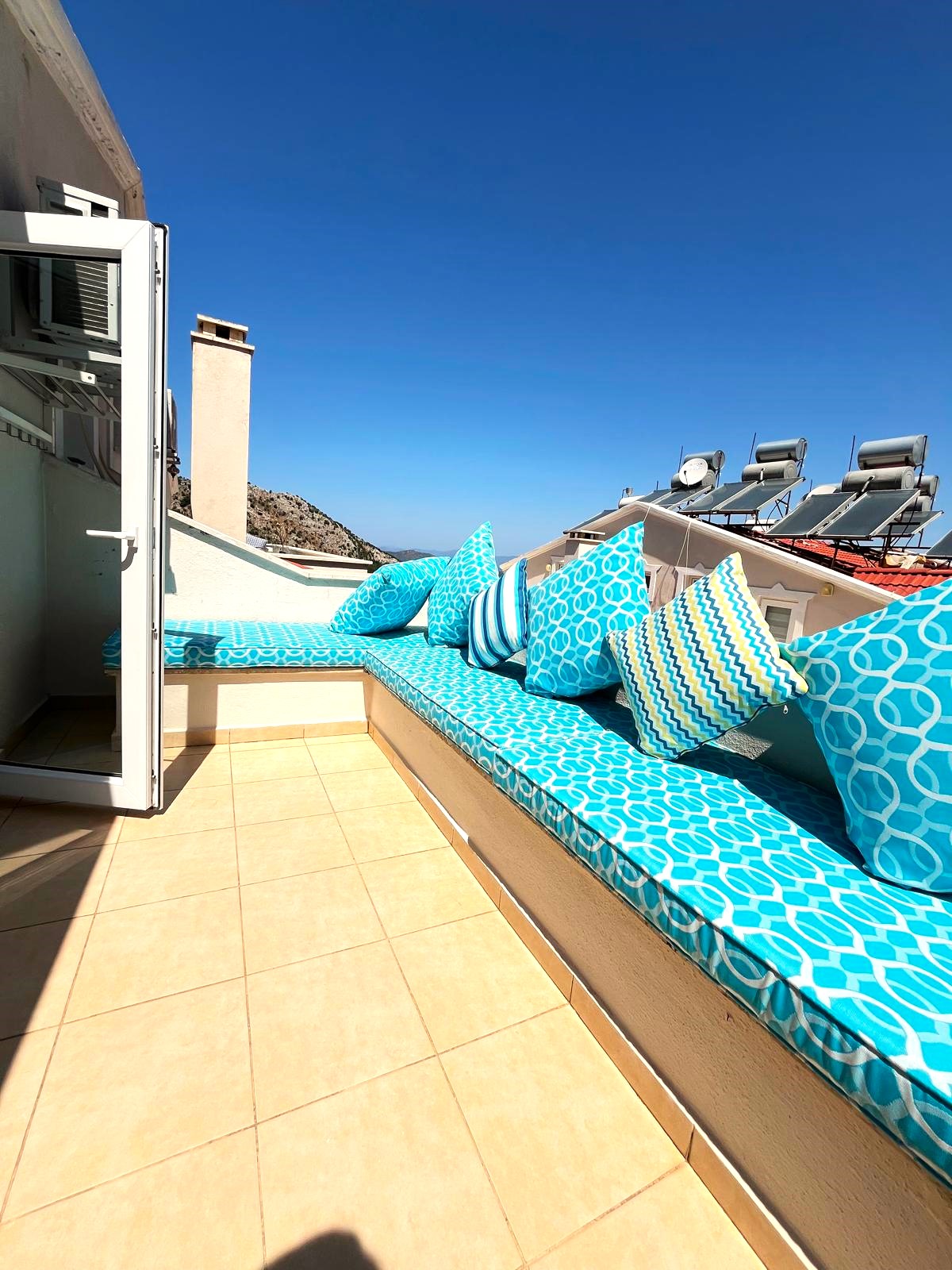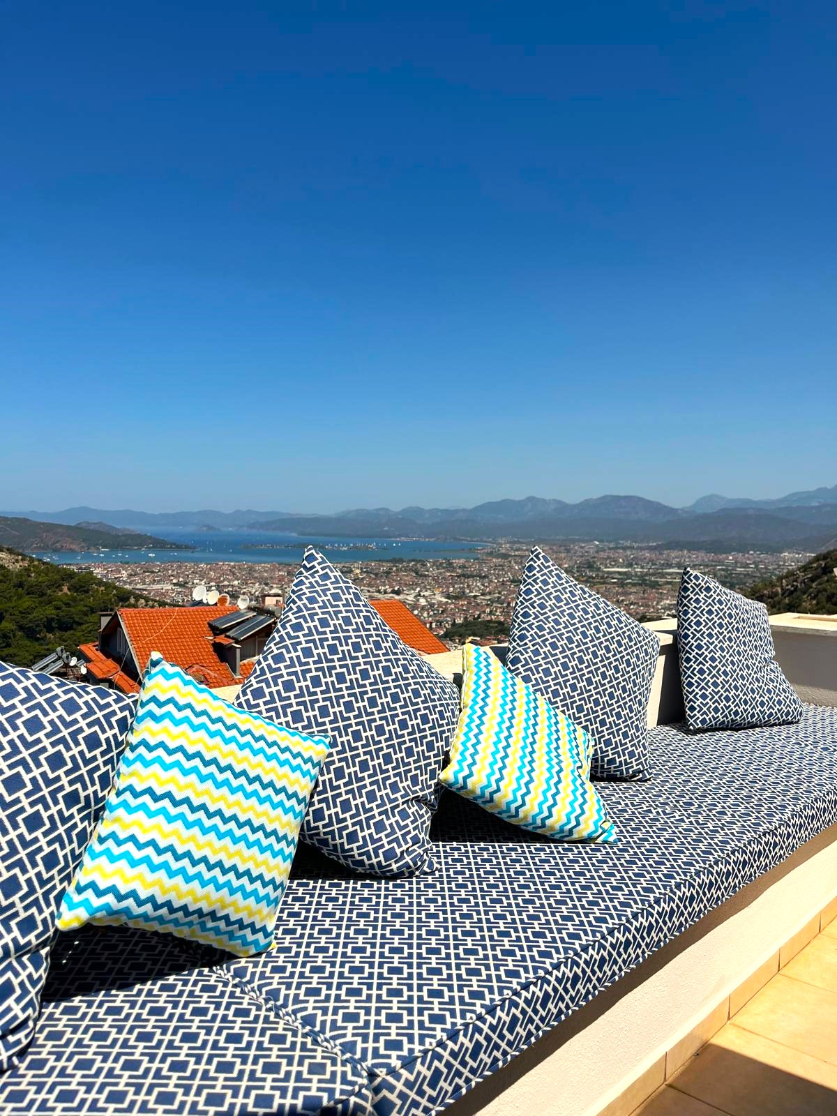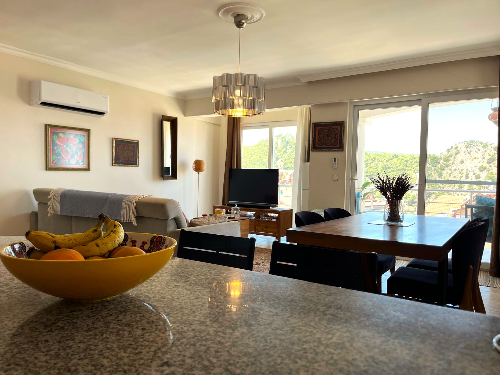 One of the standout features of this apartment is the view. Imagine waking up each day to a horizon of rolling hills, forested slopes, and a glimpse of the turquoise coast in the distance. Whether you’re enjoying a quiet evening at home or entertaining friends, the scenery provides a truly unique backdrop that elevates everyday living.